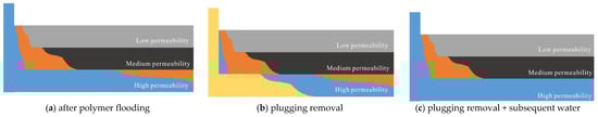 General plugging removal mechanism (a) after polymer flooding, (b) plugging removal and (c) plugging removal + subsequent water flooding.