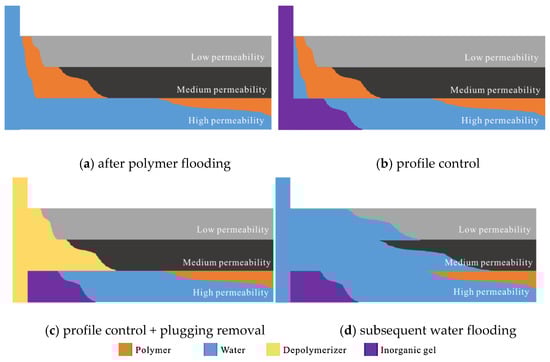 The ultimate goal of “general plugging removal” and “profile control + plugging removal” is to enhance oil recovery. The action mechanism of “general plugging removal” and “profile control + plugging removal” is shown in Figure 11 and Figure 12.