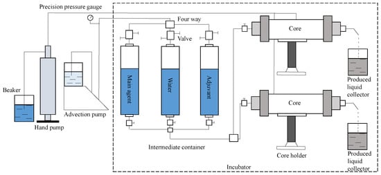 The experimental apparatus for evaluating the effectiveness of chemical drive and “profile control + plugging removal “includes components such as advection pumps, pressure sensors, intermediate vessels, and pipeline gates, all of which are placed in a 60 °C incubator except for the advection pumps and hand pumps. The flow of the experimental equipment is shown in Figure 13.