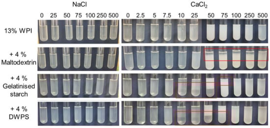According to the New Zealand Nutrition Foundation [], foods can be categorised into low-, medium- and high-salt foods, which contain < 120, 120–600, and > 600 mg sodium per 100 g of food, which translates into NaCl concentrations of approximately < 50, 50–260, and > 260 mM. On the other hand, calcium is one of the most important minerals for the human body, and the recommended dietary allowance (RDA) for calcium is ~1000 mg for adult. Dairy products such as yoghurt are a source of calcium, containing 195 mg calcium per serving (150 g, ~33 mM) []. However, one serving of yoghurt only supplies ~20% of the daily RDA for calcium, making calcium-fortified foods the effective alternative to increase calcium intake. The effect of salts was evaluated in this study at the relevant concentrations between 0 and 500 mM. The phase stability of 13% WPI and 13% WPI + 4% maltodextrin or gelatinised starch or DWPS with the addition of NaCl or CaCl2 (0–500 mM) after 24 h at 20 °C is presented in Figure 1. Samples with added NaCl did not show any visual phase separation (Figure 1). Similarly, no phase separation was noted in pure WPI solutions at CaCl2 concentrations between 0 and 500 mM. However, increasing visual turbidity was observed at increasing CaCl2 concentrations between 10 and 100 mM. The results are in agreement with previous studies, where the higher ionic strength caused the formation of larger protein aggregates that scatter the light []. The subsequent increase in CaCl2 above 100 mM resulted in a decrease in sample turbidity (without sediment being detected). The decrease in turbidity is likely due to the dissociation effect contributed by the excess of chloride ions in the system. Some of the aggregated proteins cross-linked via calcium ions could dissociate in the presence of an increasing amount of counter-ions, which affect the electrostatic interactions, hence, lowering the turbidity of the samples. Such observations have been made in 7S and 11S soy protein solutions with CaCl2 and MgCl2, where a decrease in turbidity was observed after maximum divalent salt concentrations at ~30–40 mM [].