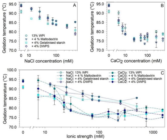The individual effects of NaCl (0–500 mM) and CaCl2 (0–500 mM) on the gelation temperature of 13% w/w WPI and mixed systems are presented in Figure 2A,B, respectively, as well as the plot against the calculated ionic strength (0–1500 mM) in Figure 2C. The gelation temperature of WPI was not significantly affected by the addition of maltodextrin or DWPS, whereas gelatinised starch significantly decreased the gelation temperature from 95 to 91 °C (Figure 2A). Such observation could be due to gelatinised starch being a larger and more negatively charged molecule (Table 1), which is better at promoting segregative interactions between starch and protein molecules, causing enhanced protein denaturation and aggregation [,]. The addition of small quantities of both NaCl and CaCl2 rapidly reduced the gelation temperature of the system by ~10–15 °C (Figure 2A,B). The reduction plateaued off at 75 mM NaCl (Figure 2A) and 25 mM CaCl2 (Figure 2B), which corresponds to a similar ionic strength of ~75 mM NaCl (Figure 2C). However, CaCl2 was clearly more effective than NaCl at reducing gelation temperature (Figure 2C). A similar observation was made by Puyol, Pérez, and Horne [], where the increase in salt concentrations resulted in a reduction in the gelation temperature of WPI. Such reduction can be attributed to enhanced aggregation contributed by the shielding of charged protein molecules by cations and intra- and inter-molecular bridges formed by calcium ions between negatively charged protein molecules [,]. In conclusion, above 75 mM total ionic strength for any of the systems (NaCl or CaCl2), the gelation temperature of both pure WPI and mixed systems was no longer significantly affected by further salt addition. Hence, the results indicate that both salts, especially CaCl2, could be used to lower gelation temperatures to minimise energy consumption during gel formation.