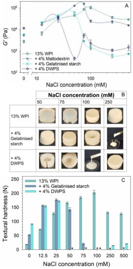Effect of NaCl on the: (A) G′ from frequency sweep at 1% strain and 1 Hz frequency of 13% w/w WPI and 13% w/w WPI + 4% w/w maltodextrin, gelatinised starch, or DWPS with 0–500 mM NaCl at 20 °C. Lines in the graphs serve as visual aids, (B) visual appearance of 13% w/w WPI and 13% w/w WPI + 4% w/w gelatinised starch or DWPS at 50, 75, 100, and 250 mM NaCl, (C) textural hardness of 13% w/w WPI and 13% w/w WPI + 4% w/w gelatinised starch or DWPS with 0–500 mM NaCl at room temperature. Values are plotted as means ± standard error. Note that compression test was not performed on inhomogeneous/paste-like gels (denoted with *).
