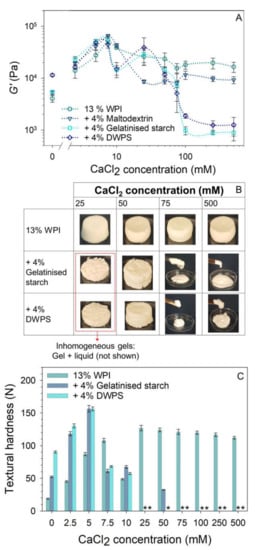 Effect of CaCl2 on the: (A) G′ from frequency sweep at 1% strain and 1 Hz frequency of 13% w/w WPI and 13% w/w WPI + 4% w/w maltodextrin, gelatinised starch or DWPS with 0–500 mM CaCl2 at 20 °C. Lines in the graphs serve as visual aids, (B) visual appearance of 13% w/w WPI and 13% w/w WPI + 4% w/w gelatinised starch or DWPS at 25, 50, 75 and 500 mM CaCl2, and (C) textural hardness of 13% w/w WPI and 13% w/w + 4% w/w gelatinised starch or DWPS with 0–500 mM CaCl2 at room temperature. Values are plotted as means ± standard error. Note that compressed test was not performed on inhomogeneous/paste-like gels (denoted with *).