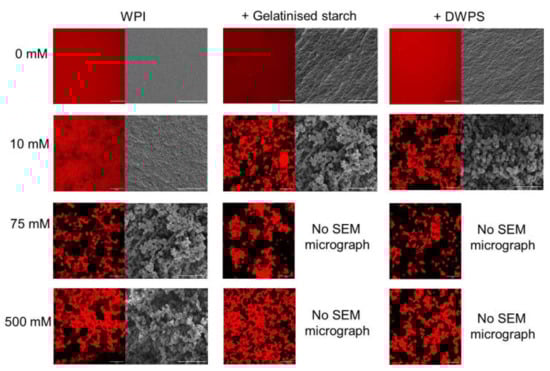 These differences in gel texture can be further explained by observing the microstructure of the composite gels (Figure 4). At a low NaCl concentration of 25 mM, the addition of gelatinised starch or DWPS to WPI seems to cause increased protein aggregation, which is evidenced by the increased roughness observed in the micrographs of composite gels as compared to that of a pure WPI sample. At 75 mM, the liquid portion was analysed using CSLM, whereas the gel portion was imaged with SEM. For the liquid portion, WPI existed as dispersed spherical droplets in the continuous phase (CSLM micrograph in Figure 4 with DWPS). Such microstructure is typical of micro-phase separation of incompatible biopolymers, where the adoption of such spherical conformation minimises the overall surface tension of the system []. On the other hand, the gel network observed by SEM at 75 mM was different from that observed at 25 mM NaCl, where the former appeared to be a more open network. The occurrence of thermodynamic incompatibility resulting in an inhomogeneous gel could be a plausible reason for the reduced G′ value of WPI + gelatinised starch or DWPS (Figure 3A). Such micro-phase separation has also been observed in 13% w/w WPI + 0.5% w/w carrageenan at 50–100 mM NaCl []. The increase of NaCl from 75 to 100 mM resulted in a change in texture from self-supporting gels with a liquid centre to a weak gel with paste-like consistency (Figure 3B). The paste-like texture is likely caused by thermodynamic incompatibility between WPI and DWPS at 100 mM NaCl, resulting in a microstructure resembling that of the liquid portion of WPI + DWPS at 75 mM (i.e., WPI unable to form a continuous network) [].