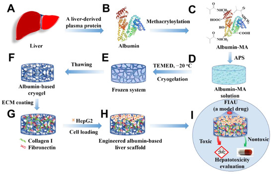 Schematic illustration presenting the fabrication of an engineered albumin-based liver scaffold for hepatotoxicity evaluation. (A) Liver. (B) Liver-derived albumin. (C) Albumin-MA was obtained via the methacryloylation. (D) Albumin-MA solution with an initiator, APS. (E) Cryogelation with a catalyzer (TEMED) under −20 °C. (F) Albumin-based cryogels after thawing. (G) ECM-coated albumin-based cryogels. (H) Cell-laden albumin-based cryogel liver constructs. (I) Hepatotoxicity evaluation.