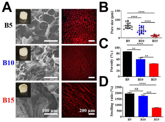 Physical characterization of three BSAMA cryogels (B5, B10, and B15). (A) Scanning electron microscopic (SEM) and confocal microscopic images (red: the wall of cryogels). Scale bar: 100 μm in SEM; 200 μm in confocal. (B) Pore size distribution. Black circles, blue squares, and red triangles represent the pore sizes of B5, B10, and B15, respectively. (C) Pore connectivity was demonstrated as a porosity (%). (D) Swelling ratio. n = 3, **: p < 0.01, ***: p < 0.005, ****: p < 0.001, NS means no significant difference between the samples at the extremities of the line. 18 pores were counted in every kind of BSAMA cryogels.