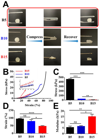 Mechanical properties of BSAMA cryogels (B5, B10, and B15). (A) Shape recovery experiments. 5% w/v BSAMA cryogels (B5) returned to the original shape when the stress was removed. (B) Strain–stress curves were recorded during the axial loading. (C) Maximum stress at a break point. (D) Maximum strain at a break point. (E) Young’s modulus was determined by the slope of the stress–strain curve from 10% to 20% strain. n = 3, *: p < 0.05; **: p < 0.01, ***: p < 0.005, ****: p < 0.001, NS means no significant difference between the samples at the extremities of the line.