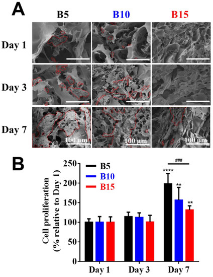 Cell viability on BSAMA cryogels (B5, B10, and B15) for 7 days. (A) SEM images of the inside of cell-laden cryogels at day 1, day 3, and day 7. The outline of cells is marked in red. Scale bar: 100 μm. (B) Cell proliferation. n = 3, **: p < 0.01, ****: p < 0.001, compared to the same cryogel type on the day 1. ###: p < 0.005, between the samples at the extremities of the line.
