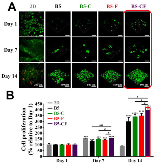 The 3D cell experiments were carried out to investigate the cell viability and proliferation of BSAMA cryogels and ECM-modified BSAMA cryogels. Cell viability and proliferation were visualized via live (calcein, green fluorescence)/dead assay (EthD-1, red fluorescence), as seen in Figure 6A, illustrating that the porous architecture of the albumin-based cryogel scaffolds has a positive effect on facilitating cell distribution and proliferation. The growth of cells on the 2D culture substrates was obvious from day 1 to day 7; some dead cells were found at day 14 probably because of the limited space for cell growth and spreading. In contrast, some viable cells were observed in a cross-section of 3D scaffolds (B5, B5-C, B5-F, and B5-CF) at day 1; cells within the 3D scaffolds appeared to proliferate over time. At day 7 and day 14, the significant increase in cell density in B5, B5-C, B5-F, and B5-CF scaffolds was observed whereas dead cells were scarce. Moreover, live cells with a higher density appeared visible on the B5-CF scaffolds when compared to cells cultured in B5, B5-C, and B5-F scaffolds.