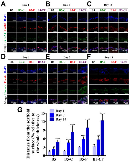 After seeding HepG2 cells into albumin-based cryogel scaffolds (6 mm in diameter and 2.5 mm in thickness), cells were expected to migrate into the cryogels because albumin-based cryogel scaffolds exhibited an interconnected porous structure as presented in Figure 5. Firstly, cell distribution in cryogels was assessed by SEM images of the surface and inside of the scaffolds, as well as confocal microscopic images. When cells were seeded on the top of the porous albumin-based cryogel scaffolds, few cells were found in middle sections (Figure S3A). Seven days after seeding cells (Figure S3B), more cells were found to spread on the surface and accumulate in the middle of the cryogel scaffolds. At day 14 (Figure S3C), a great number of cells were found inside the scaffolds. To further characterize the infiltration of cells into scaffolds, cell nucleus, f-actin, and the specific protein expression (albumin and CYP3A4) inside the cell-laden scaffolds were further examined in the cross-section images of cell-laden scaffolds as seen in Figure 7A–G. After cell seeding, cells were found on the surface of the scaffolds, but few cells were found within the scaffolds. Over time, the deeper infiltration of cells was detected within the scaffolds, and the deepest accumulation of cells was identified at day 14 post seeding. The effect of ECM proteins on cell infiltration in ECM-coated BSAMA cryogels (B5-C, B5-F, and B5-CF) was greater than in the bare BSAMA cryogels (B5). Specifically, the most significant infiltration was observed in B5-CF. The total depth of cryogel scaffolds was about 2.5 mm; around 12% of the scaffold in depth was observed to be used for cell migration and infiltration judging from the confocal results, which suggested that these 3D BSAMA cryogel scaffolds still had more space for further cell growth and migration.