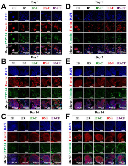 In order to examine the influence of these porous albumin-based cryogels on cell specific functions, cells on 2D substrates and in 3D albumin-based cryogels were evaluated via immunofluorescent staining and RT-qPCR assay as displayed in Figure 8 and Figure 9. The target hepatic markers of immunofluorescent staining were albumin and CYP3A4 that are an important secretory protein and a drug metabolic enzyme, respectively. The confocal images show some changes in the expression level of intracellular albumin and CYP3A4 as well as in cell morphology during the culture period, on day 1 (Figure 8A,D), day 7 (Figure 8B,E), and day 14 (Figure 8C,F). Overall, cells on the 2D substrates appeared to express a relatively good amount of albumin and CYP3A4 from day 1 to day 7 and seemed to decrease their expression later on day 14. In addition, cells on the 2D substrates seemed to lose their original cell morphologies (clear forms of cell aggregates) at day 14. By contrast, cells in the 3D albumin-based cryogels started to form small aggregates and then became big aggregates over the culture period, potentially leading to improved cell–cell interactions and cellular functions. Notably, an intense expression level of CYP3A4 and albumin especially in B5-CF scaffolds was observed at day 14. Over time in culture, the cell clusters developed themselves into spherical aggregates where it was difficult to distinguish a single cell anymore. The size of the growing hepatic aggregates became bigger over time. Hence, cells on the 3D albumin-based cryogels aggregated together during the culture period, which could improve cell–cell interactions [57].