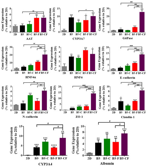 In general, every tested gene was highly upregulated in the 3D albumin cryogel scaffolds as compared to those in the 2D substrates. The gene expression level of albumin and CYP3A4 increased more greatly in the 3D albumin-based cryogels than those on the 2D substrates. Notably, the expression level of albumin and CYP3A4 in B5-CF was the highest among the albumin-based cryogel scaffolds, which is consistent with the results of albumin and CYP3A4 immunostaining. Moreover, a similar pattern was observed in the expression of alpha 1-antitrypsin (AAT), hepatocyte nuclear factor (HNF4α), glucose 6-phosphatase (G6Pase), and CYP3A7. Particularly, cells within B5-CF expressed AAT, G6Pase, and HNF4α at the highest levels among the other samples. As for cell junction genes, the secretion level of zonula occludens (ZO)-1 in B5-CF, a component of the junctional complex between cells that can play a vital role in cell–cell direct contacts via functioning in signal transduction pathways related to gene expression and cell behavior [61], was significantly higher than that in the other samples. On the other hand, claudin-1 was highly upregulated in 3D albumin-based cryogel samples, and the expression level of claudin-1 in B5-CF was higher than that of B5 (p < 0.01), B5-C (p < 0.0001), and B5-F (p < 0.005). Finally, cadherins (E-cadherin and N-cadherin) are a type of cell adhesion molecule (CAM) and are important in the formation of adherent junctions to allow cells to adhere to each other. The expression level of E-cadherin and N-cadherin in B5-CF scaffolds was the highest among the samples. E-cadherin is required for contact-induced polarity in many epithelial cell types [60]. It was reported that hepatocytes had a unique polarized microenvironment to exert their particular activities in the 3D environments of the liver. [62] Therefore, it is paramount to maintain hepatic polarization, and the highest E-cadherin expression level in B5-CF indicates that B5-CF could offer cells a liver-mimetic polarized microenvironment to maintain the hepatocyte-specific features. The extracellular matrix (ECM) of the liver contains various proteins (e.g., collagen, fibronectin, and laminin). Our gene expression results demonstrate that the dual ECM (collagen and fibronectin) coating strategy can more closely mimic the ECM environments of liver and produce better hepatic functions than the single ECM coating, which is consistent with other reports [54,63].