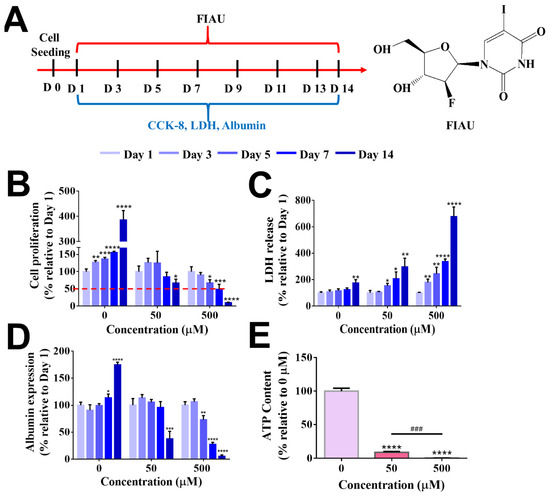 Evaluation of FIAU-induced cytotoxicity in B5-CF scaffolds at day 1, day 3, day 5, day 7, and day 14. (A) Experimental timeline for the drug administration. (B) Cell proliferation. (C) Cytotoxicity (LDH release). (D) Albumin expression was assessed at different time points after FIAU treatment (n = 3, *: p < 0.05, **: p < 0.01, ***: p < 0.005, ****: p < 0.001), compared to the same cryogel type at day 1. (E) Evaluation of FIAU-induced human-specific toxicity, mitochondrial disfunction in B5-CF scaffolds. ATP content in cell-laden B5-CF was assessed at the end of 14 days after FIAU treatment. n = 3, ***: p < 0.005, ****: p < 0.001, compared to the group without FIAU treatment. ###: p < 0.005, between the samples at the extremities of the line. The red dashed line indicates the 50% relative cell proliferation.