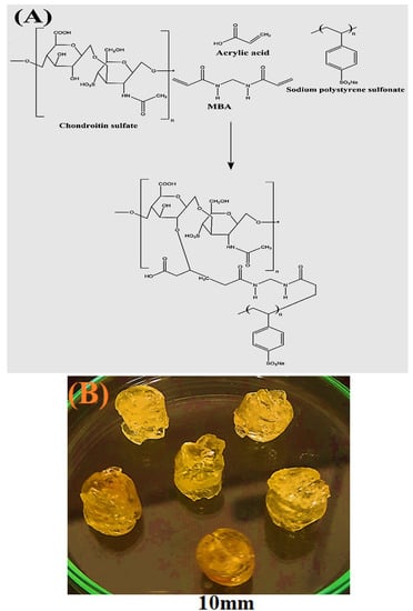 Chondroitin sulfate (Cs) is composed of D-glucuronic acid connected to N-acetyl-D-galactosamine. It is a natural polysaccharide polymer. Its solubility in water is high. The biological source of Cs is the cartilage of animals []. Cs protects the connective tissues by regulating the water content, thus, it has been used in the treatment of severe disorders such as atherosclerosis, osteoarthritis, and thrombosis for a long time [,]. Cs absorbs a greater quantity of water because it contains COO− and –SO3− functional groups, thus, it is used widely in hydrogel preparation []. Polystyrene sulfonate is a polydisperse linear sulfonated, antimicrobial, and non-cytotoxic polymer. The solubility of polystyrene sulfonate is very high in water and aqueous alkaline solutions, if its molecular weight is 500–800 kDa. Sodium polystyrene sulfonate (Sps) is the sodium salt of polystyrene sulfonate, which is used for various purposes, including cosmetics, multilayer membranes of polyelectrolyte for controlled drug release, exchange membranes of proton for fuel cells, and medicines to manage hyperkalemia (abnormally high potassium or lithium levels in the blood). Because of SO3, Sps absorbs a greater amount of water, and thus is frequently used in the development of hydrogels [,]. Acrylic acid (Aca) is a synthetic pH-sensitive monomer, which shows maximum swelling at high pH values as compared to low pH values, and thus is used mostly in the fabrication of pH-sensitive hydrogels. Because of COOH functional groups, Aca increases the sensitivity of the medium, thus showing its protonation and deprotonation in low- and high-pH media. Due to its pH-sensitive nature, maximum swelling and drug release are detected at neutral pH, while low in an acidic medium, thus protecting the encapsulated drug from the acidity of the stomach. Therefore, Aca is used in both pharmaceutical and biomedical fields [].