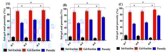 During the polymerization technique, a soluble part of hydrogel contents is not crosslinked, while an insoluble part is crosslinked. The soluble and uncrosslinked part of the hydrogel is recognized as sol-fraction, while gel fraction is the insoluble and crosslinked part of the hydrogel. Sol-gel analysis was performed for the developed hydrogel with the purpose of evaluating its sol and gel fraction. Both sol and gel fractions were influenced by the different compositions of Cs, Sps, and Aca, as shown in Figure 2A–C. A rise in gel fraction was observed with the increasing compositions of Cs and Sps (Figure 2A,B). The higher the amount of Cs and Sps, the greater the availability of free radicals, thus higher the gelation and polymerization of both polymers with monomer. Similarly, an increase in the composition of Aca (Figure 2C) led to the generation of a high number of free radicals, which were crosslinked with the polymers, and thus, a resulting increase in gelation was observed. The same effects of hydrogel contents were observed by Khanum and her coworkers [], which further support our findings. In contrast to gel fraction, a drop was seen in sol fraction with the increasing compositions of Cs, Sps, and Aca, due to the inverse relation with gel fraction. Decrease in sol fraction leads to an increase in gel fraction, and vice versa []. p values were found less than 0.05 for all formulation, which were identified with (*) as shown in Figure 2A–C.
