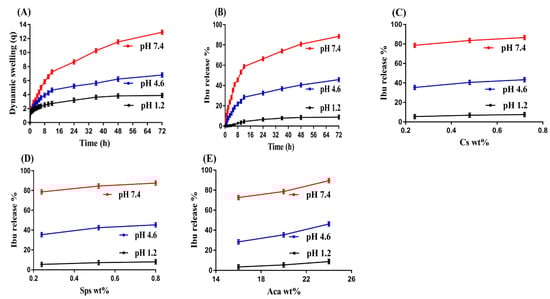 Effect of pH on (A) dynamic swelling and (B) percent of drug released from Cs/SpsCpAca hydrogel. Effect of (C) Cs, (D) Sps, and (E) Aca on percent of drug released from Cs/SpsCpAca hydrogel.