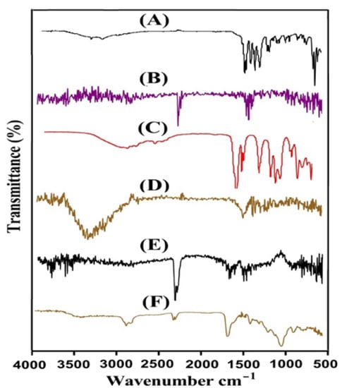 FTIR spectra of (A) Cs, (B) Sps, (C) Aca, (D) unloaded Cs/SpsCpAca hydrogel, (E) Ibu, and (F) loaded Cs/SpsCpAca hydrogel.