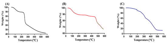 TGA thermogram of (A) Cs, (B) Sps, and (C) Cs/SpsCpAca hydrogel.