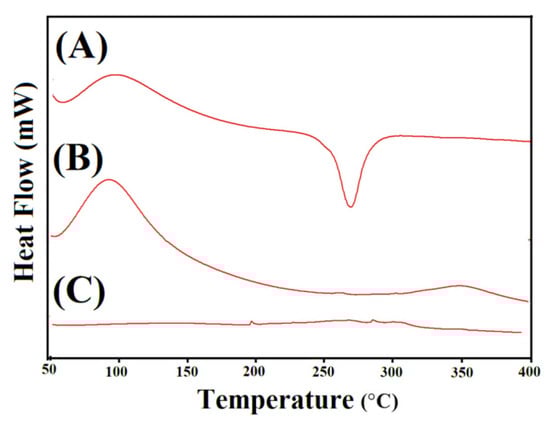 DSC thermogram of (A) Cs, (B) Sps, and (C) Cs/SpsCpAca hydrogel.