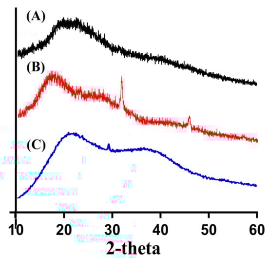 PXRD of (A) Cs, (B) Sps, and (C) Cs/SpsCpAca hydrogel.