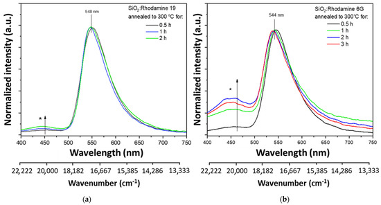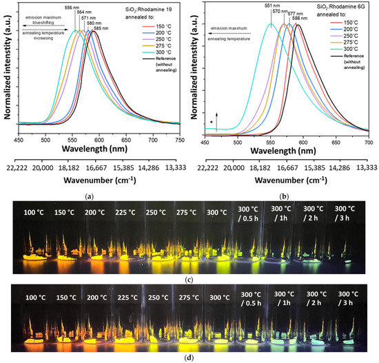 As shown in Figure 1a, material doped with Rhodamine 19 shows a substantial blue shift (shift of emission maxima towards higher energies) with increasing annealing temperature. The shift is about 30 nm (892 cm−1), from 585 nm observed at 150 °C to 556 nm at 300 °C. Photographs of annealed layers (Figure 1c) show different emission colors depending on the applied annealing temperature upon excitation with a UV lamp (λex = 360 nm).