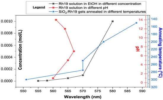 As the pH-dependent effect did not explain the significant shift towards high energies, concentration-dependent measurements were also made. On their basis, a spectroscopic effect similar to the synthesized material became visible. High-concentration Rhodamine 6G solution emission can be observed above 600 nm in the range of 600–680 nm [43]. With decreasing dye content, a blue shift of luminescence is observed. It appears that intensity also changes, reaching a maximum at 10−4 g/mL Rh6G. The blue shift begins to even out with further dilution, and the intensity drops again [44]. It was observed that for intermediate concentrations, the shape of the spectrum indicates two overlapping components [45]. The relationship between pH and concentration compared to the results obtained with the gels is plotted in Figure 2 (while measured spectra are shown in Supplementary Figure S5).