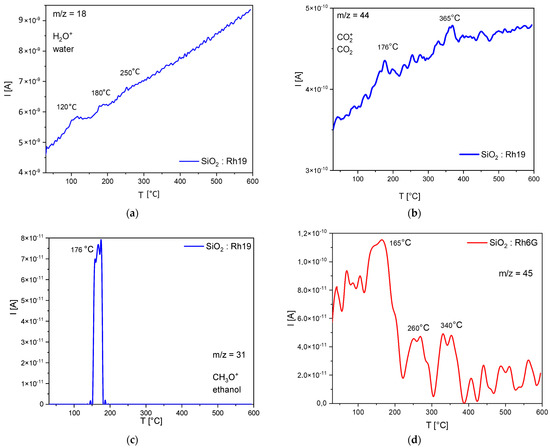 The first loss (30–50 °C) is related to the desorption of moisture from the sample—most likely water adsorbed on the surface. The next step (50–138 °C) concerns the desorption of the permanent moisture bonded to the material’s surface—chemically bonded moisture or a water condensation reaction in the sol-gel system. Further heating of the materials (138–200 °C) likely results in the alcohol condensation reaction in the sol-gel system, which produces primary alcohol (e.g., ethanol). The next step is related to the melting and partial thermal decomposition of rhodamine, which is most likely absorbed at the surface (200–300 °C), consistent with the data sheets of the dyes used. During this process, water and carbon dioxide are released. A further increase in temperature (above 450 °C) results in a progressive evolution of water and carbon dioxide (without a clear peak), most probably associated with the next step of rhodamine decomposition and/or further reactions of the sol-gel system. The maximum of this process is probably observed above the set temperature range.