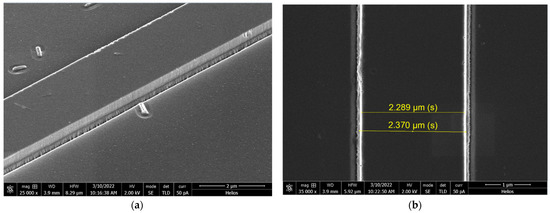 SEM images prepared for layer doped with Rhodamine 6G after etching (CHF3-50, Ar-5, 0.3 Pa, 600 W, 165 V, oil, 26 °C, 200 s; the depth of etching was 350 nm): (a) etched layer, side view; (b) the etched layer, top view, and the marked scale correspond to the distance between the two boundaries of the waveguide.