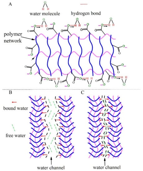 (A) Schematic diagram of the structure of chitosan-based hydrogel network. (B) High water content hydrogels network with water channels filled with free water. (C) In the low water content hydrogels network, the narrow water channels are filled with very little free water.