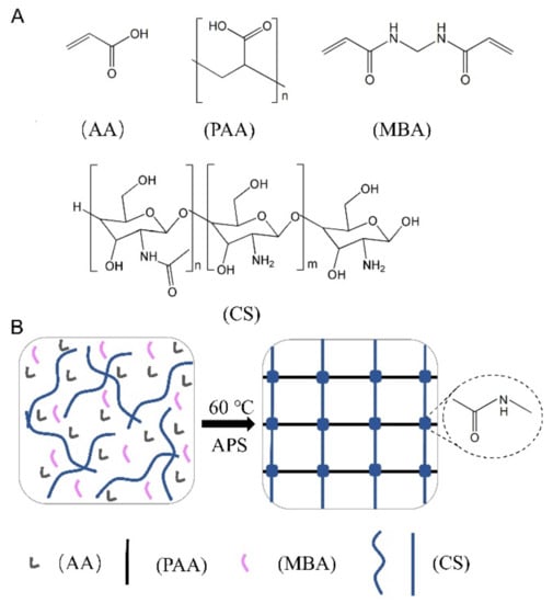 (A) Structural formulas of acrylic acid (AA), polyacrylic acid (PAA), chitosan (CS), and N, N′-Methylenebis(acrylamide) (MBA). (B) Schematic diagram of the one-pot method for the synthesis of CS-based hydrogels.