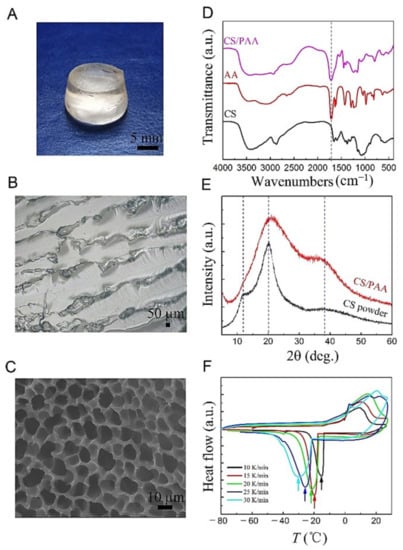 (A) Photos of the wet-hydrogels (fw ~ 0.73). (B) Optical photograph of the wet-hydrogels microstructure. (C) ESEM image of the dried hydrogels morphology. (D) FTIR spectra of chitosan (CS) powder, acrylic (AA) liquid, and dry chitosan-based hydrogels samples. (E) XRD patterns of chitosan (CS) powder and dried chitosan-based hydrogels samples. (F) DSC curves of chitosan-based hydrogels samples measured in cooling-heating cycles with cooling/heating rates of 10 K/min, 15 K/min, 20 K/min, 25 K/min, and 30 K/min, respectively.