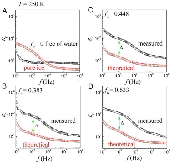 Dielectric constant εr(f) vs. frequency (f) curves for all hydrogels at T = 250 K. (A) εr(f) curves of pure ice and dry chitosan-hydrogels. (B–D) Measured permittivity εr(f) (black open squares) and theoretical permittivity εr(f) (red open circles) for the hydrogels with fw of 0.383, 0.448, and 0.633, where the symbols Δ represent the difference between the measured and theoretical permittivity εr(f) in the low and mid frequency range.
