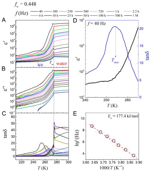 (A–C) Measured the real part of permittivity ε’, imaginary part of permittivity ε”, and loss tanδ as a function of temperature T at several frequencies, respectively, which are the hydrogels (fw = 0.448) data measured from the heating program starting at 200 K. For more clarity, the measured ε’(T) and tanδ (T) data at f = 40 Hz are shown in (D). (E) Calculated the activation energy Ea by the Arrhenius equation and evaluated the relationship between Tmax and f.