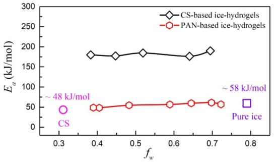 We also plot the activation energies of non-covalent polyacrylonitrile (PAN)-based ice-hydrogels with different fw in Figure 6, which is compared with the data for covalent hydrogels. The activation energy of non-covalent ice-hydrogels has been reported to be roughly 50–60 kJ/mol. It is not difficult to find that there is a large difference between the activation energy values of the covalent CS-based ice-hydrogels and the non-covalent PAN-based ice-hydrogels. This is mainly related to the chemical composition of the hydrogels. CS-based hydrogels are covalently cross-linked and have high dielectric activation energy, which suggests a strong coupling effect of the dipole at the interfacial layer. In contrast, PAN-based hydrogels are non-covalently cross-linked and have low dielectric activation energy, manifesting as weak coupling effect of dipoles at the interfacial layer.