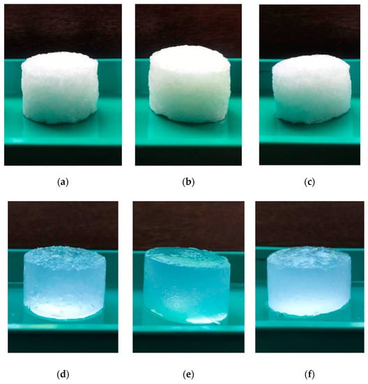 Stages in the investigation of the hydrogels based on cellulose allomorphs: (a–c) dry state of the hydrogels H-CI, H-CII, and H-CIII, and (d–f) wet state of the hydrogels H-CI, H-CII, and H-CIII.
