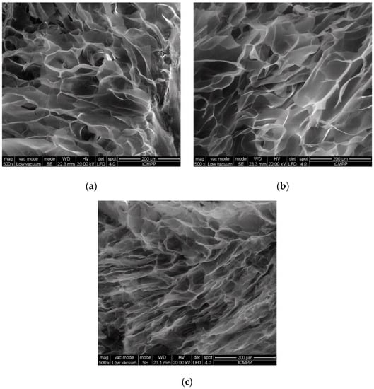 SEM is a relatively simple morphological analysis technique that requires minimum sample preparation and provides solid and realistic information regarding the spatial arrangement of any given material []. Therefore, SEM was used to study the surface features of the hydrogels based on cellulose allomorphs and to collect data with respect to the appearance, integrity, porosity, and degree of uniformity of the hydrogels. This technique offers essential details regarding the morphological aspects of the hydrogels, which ranged from millimeters down to micrometers.