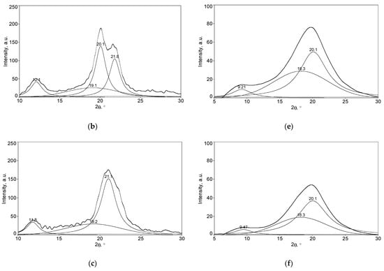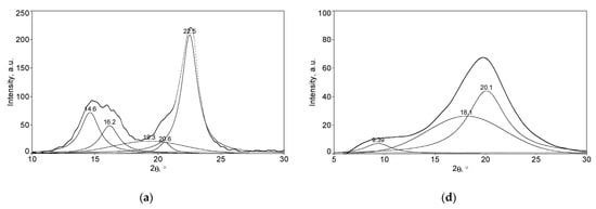 XRD investigations were performed by using a Bruker-AXS D8 ADVANCE (Bruker AXS GmbH, Karlsruhe, Germany) apparatus, having a transmission type goniometer based on Ni-filtered, Cu-Kα radiation at 40 kV. The goniometer was scanned stepwise every 10° from 10° to 40° within the 2θ range. The resulting diffraction patterns exhibited peaks that were deconvoluted from a background scattering by using Lorenzian functions, while the diffraction pattern of an artificially amorphized sample was approximated by a Gaussian functions curve fitting analysis [,]. The data were obtained using XRD Commander software (Bruker AXS GmbH, Karlsruhe, Germany) and were processed with DIFFRAC.EVA V1.1 (Bruker AXS GmbH, Karlsruhe, Germany). The crystallinity index (CrI) was calculated by using the following equation []: