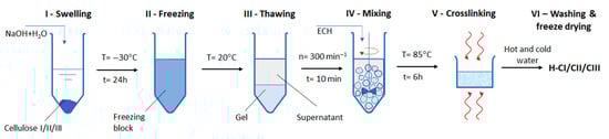 Considering the above-mentioned dissolution method [] and the high applicative potential of the hydrogels, the authors intended to obtain hydrogels with controlled densities, porosities, and swelling degrees, starting from the allomorphic forms of cellulose with different crystalline structures.