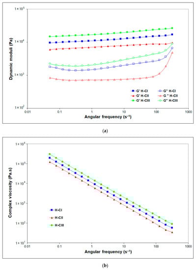 The graph shown in Figure 9a reveals that the structure of H-CII is softer, with a lower resistance of the hydrogel (G′) over the tested oscillation frequencies compared with H-CIII, but its stable structure is maintained. At higher angular frequencies (over 100 s−1), the loss (viscous) moduli increase, although not overlapping the storage moduli, maintains the gel-like behavior up to 500 s−1, the highest tested angular frequency.