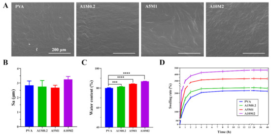 4.3.7. Water Content, Swelling Ratio, and Contact Angle