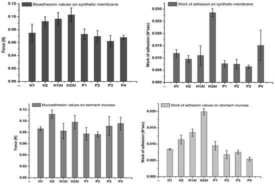 3.8. Bioadhesion and Mucoadhesion Tests