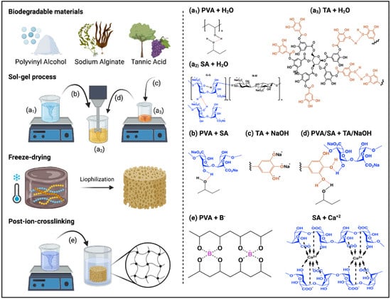 Schematic representation of the aerogels’ preparation process and the possible reactions between PVA/TA/SA aerogels and post-ion-crosslinking with CaCl2 and H3BO3 (Created with Biorender.com Agrmt. No. EV240EKOH).