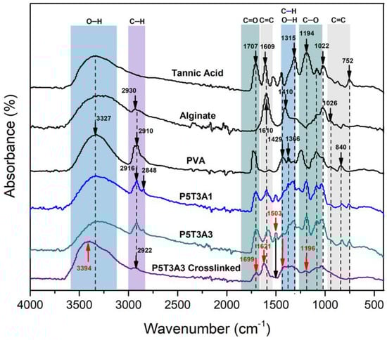 Furthermore, the C=O stretching from residual acetate groups from the partially hydrolyzed PVA [], and esters from TA showed a reduction in its absorption, and the band shifted to 1707 cm−1. Moreover, the peaks detected at 1609, 1503, and 1040 cm−1 indicate the presence of C=C stretching due to TA benzene moieties [,]. The wavelengths at 1609 and 1410 cm−1 correspond to COO, and the one at 1043 cm−1 corresponds to C–O stretching from SA [,]. Furthermore, there are four C–O stretching signals from TA located at 1315, 1194, 1022, and 1085 cm−1 []. Finally, two characteristic peaks can be observed in the fingerprint region at 840 and 752 cm−1. The first one was attributed to the overlapping of mannuronate from SA [] and C–C stretching vibration from PVA [], and the second one was attributed to C–H out of plane from TA [].