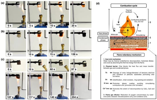 Flame behavior of (a) P5, (b) P5T3A3 uncrosslinked, and (c) crosslinked aerogels under Bunsen burner. (d) Diagrammatic scheme of combustion cycle and the flame retardant mechanism (Created with Biorender.com Agrmt. No.HF242VFEC0).