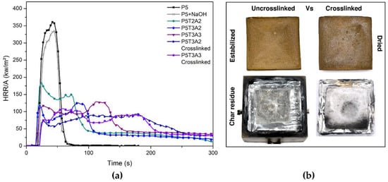 (a) Main representative HRR curves from uncrosslinked and crosslinked PVA/TA/SA aerogels; (b) digital photographs from P5T3A3 uncrosslinked and crosslinked aerogels before and after combustion at 50 kW/m2.