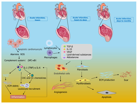 Coronary atherosclerosis will result in a narrowing of the lumen and insufficient blood supply. When collateral circulation is not fully established and blood supply is sharply reduced, myocardial ischemia lasting more than 1 h will lead to MI [19]. After MI, with the decrease of ATP (adenosine triphosphate) level in the endocardium, ischemic heart or susceptible myocardial cells can no longer maintain their structural integrity [20]. In this case, ultrastructural changes occur, resulting in irreversible damage, which eventually leads to apoptosis or necrosis of myocardial cells. In the healing stage, MI has gone through the stages of inflammation, proliferation, and healing [21]. As shown in Figure 1, in the inflammatory phase, the generation of ROS (reactive oxygen species) activates the complement system, stimulates the expression of P-selectin, and activates the NF-κB (nuclear transcription factor-κB) system to upregulate the synthesis of cytokines and chemokines [22]. Releases pro-inflammatory mediators IL-1 (interleukin-1), (TNF)-α (tumor necrosis factor-α), and IL-6 (interleukin-6), which further upregulates the expression of CXC and CC chemokines, thereby promoting leukocyte chemotaxis, triggering an inflammatory cascade, while further helping to clear necrotic cells and cellular matrix debris [23,24]. Subsequently, negative regulation of TLR (toll-like receptor) signaling, etc., induces and releases anti-inflammatory molecules thereby transitioning to the proliferative phase. Such as TGF-β (transforming growth factor-β), IL-10 (interleukin-10), aldosterone’s broad lipid-derived mediators, and VEGF (vascular endothelial growth factor), etc., thereby activating anti-inflammatory pathways [25]. Cardiac fibroblasts are transformed into myofibroblasts, and the ECM (extracellular matrix) gradually deposits proteins, during which angiogenesis in the infarcted area provides oxygen and nutrients to the metabolically active mesenchymal cells in the healing infarcted area [26,27]. As the infarcted area heals, a new myocardial matrix is gradually established, scarring is formed, the ventricle dilates to maintain cardiac output and cardiac repair transitions to maturity. Healing of the infarct is intertwined with the geometric remodeling of the chamber, with dramatic changes in ventricular geometry, dilation of the chamber, and thinning of the infarcted portion, leading to ventricular remodeling [28].