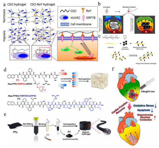 - Chen, G.; Li, J.; Song, M.; Wu, Z.; Zhang, W.; Wang, Z.; Gao, J.; Yang, Z.; Ou, C. A Mixed Component Supramolecular Hydrogel to Improve Mice Cardiac Function and Alleviate Ventricular Remodeling after Acute Myocardial Infarction. Adv. Funct. Mater. 2017, 27, 1701798. [Google Scholar] [CrossRef]