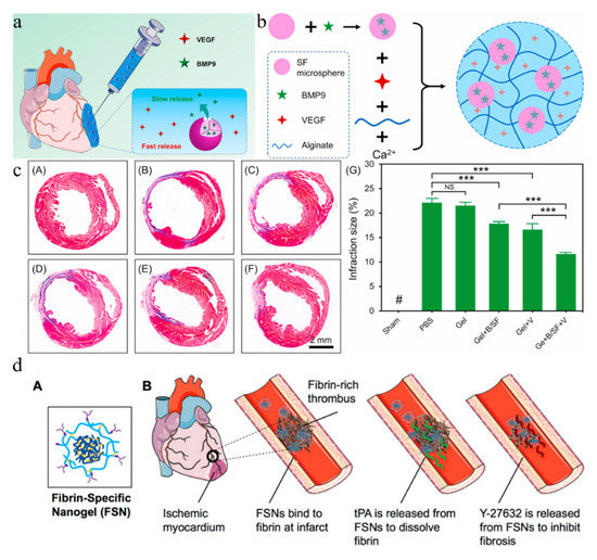 (a) Hydrogel-loaded BMP9 and VEGF in the treatment of myocardial infarction [159]. (b) Schematic of the preparation process of the composite hydrogel [159]. (c) Assessment of fibrosis in the infarct area 28 days post-MI and quantitative analysis of the infarction size as expressed by the ratio of infarct area to total left ventricular area. (A–F) Representative images of infarcted sections performed by Masson’s trichrome staining. (A) Sham, (B) PBS, (C) Gel, (D) Gel + B/SF, (E) Gel + V, (F) Gel + B/SF + V. (G) Quantitative analysis of the infarction size as expressed by the ratio of infarct area to total left ventricular area. [159]. (d) (A) Fibrin-specific nanogel design. (B) drug-loading FSNs bind to fibrin at the site of infarction, releasing fibrinolytic drugs and small molecule cell contractile inhibitors to alleviate cardiac fibrosis (Reprinted with permission from Ref. [160]. 2018, American Chemical Society). Level of significance (***—p < 0.001, NS—not significant).