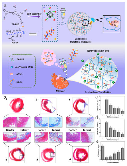 - Wang, W.; Tan, B.; Chen, J.; Bao, R.; Zhang, X.; Liang, S.; Shang, Y.; Liang, W.; Cui, Y.; Fan, G.; et al. An injectable conductive hydrogel encapsulating plasmid DNA-eNOs and ADSCs for treating myocardial infarction. Biomaterials 2018, 160, 69–81. [Google Scholar] [CrossRef]