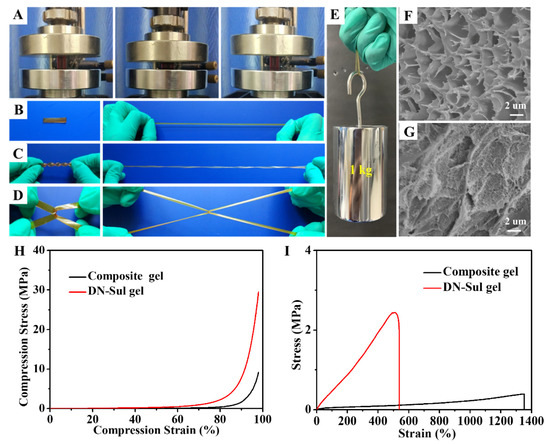 The mechanical properties of the DN hydrogel. (A) Compression, (B) stretching, (C) twisting–stretching, and (D) crossing–stretching. (E) Load-bearing ability (loading weight: 1 kg). SEM images of (F) the composite hydrogel and (G) the DN hydrogel. (H) Compressive and (I) tensile curves of the composite and DN hydrogels.